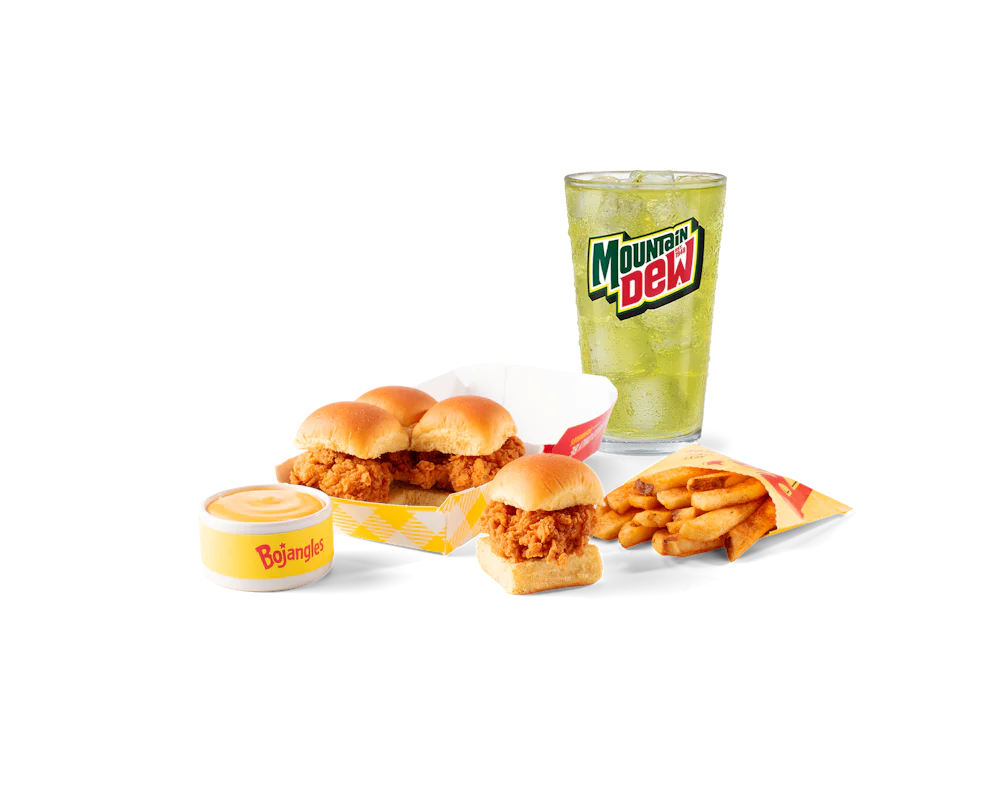 Hand-breaded chicken tender bites, cooked to crispy perfection and served in warm, soft potato slider buns. Served with your choice of sauce, and your choice of fixin' and drink.